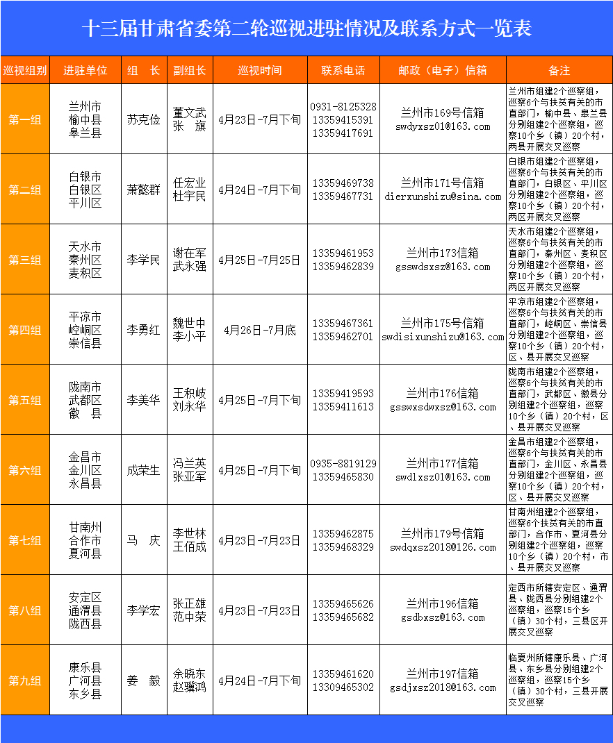 根据省委统一部署,十三届省委第二轮巡视进驻工作陆续结束。4月23日至26日,省委9个巡视组分别进驻兰州市、白银市、天水市、平凉市、陇南市、金昌市、甘南州7个市(州)及榆中县、皋兰县、白银区、平川区、秦州区、麦积区、崆峒区、崇信县、武都区、徽县、金川区、永昌县、合作市、夏河县、安定区、通渭县、陇西县、康乐县、广河县、东乡县等20个县(市、区)开展巡视。